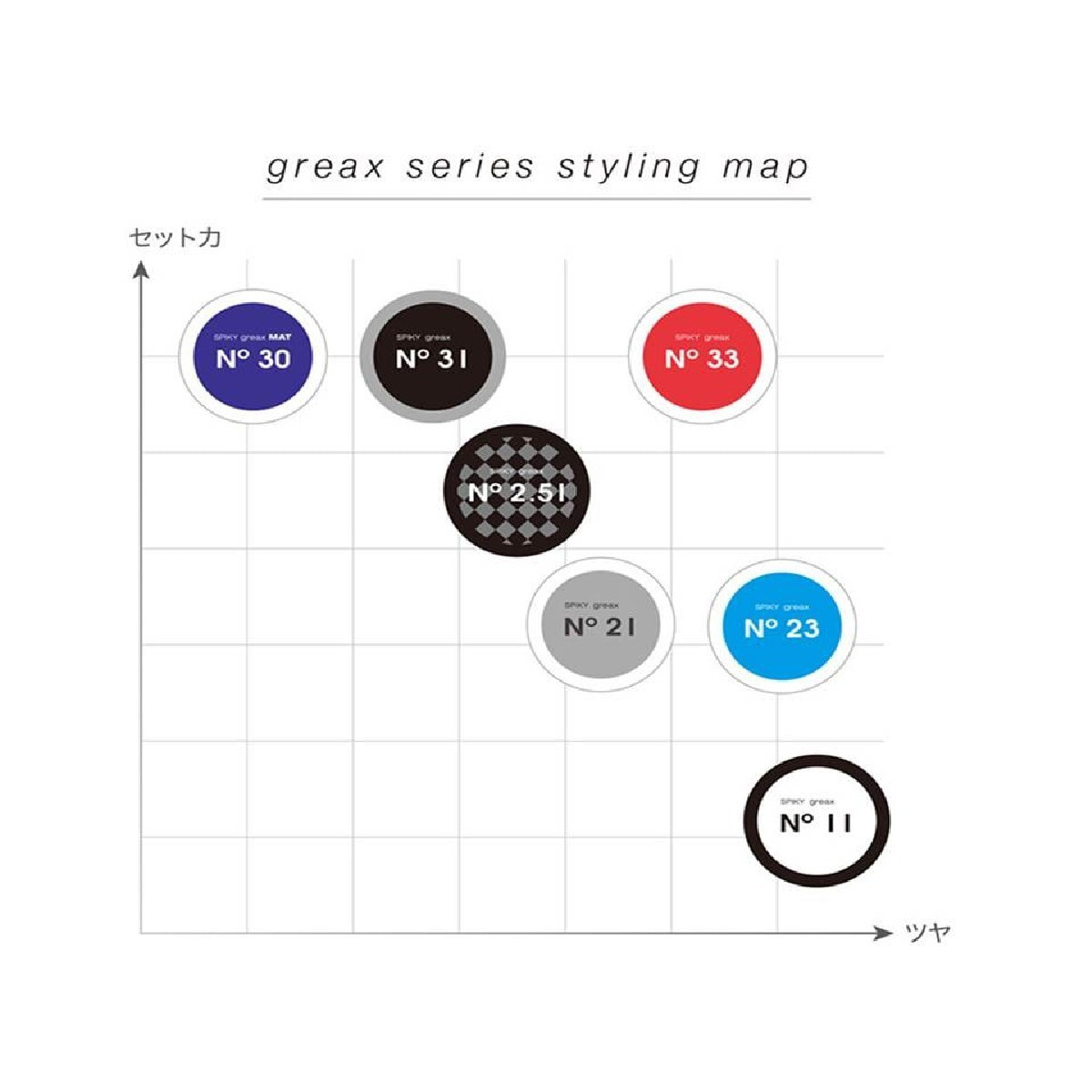 商品ごとにツヤを与えるグリース成分とセット力を高めるワックス成分の配合比率を変えているため、ツヤツヤからマットまで、お好みの仕上がりを選べます。