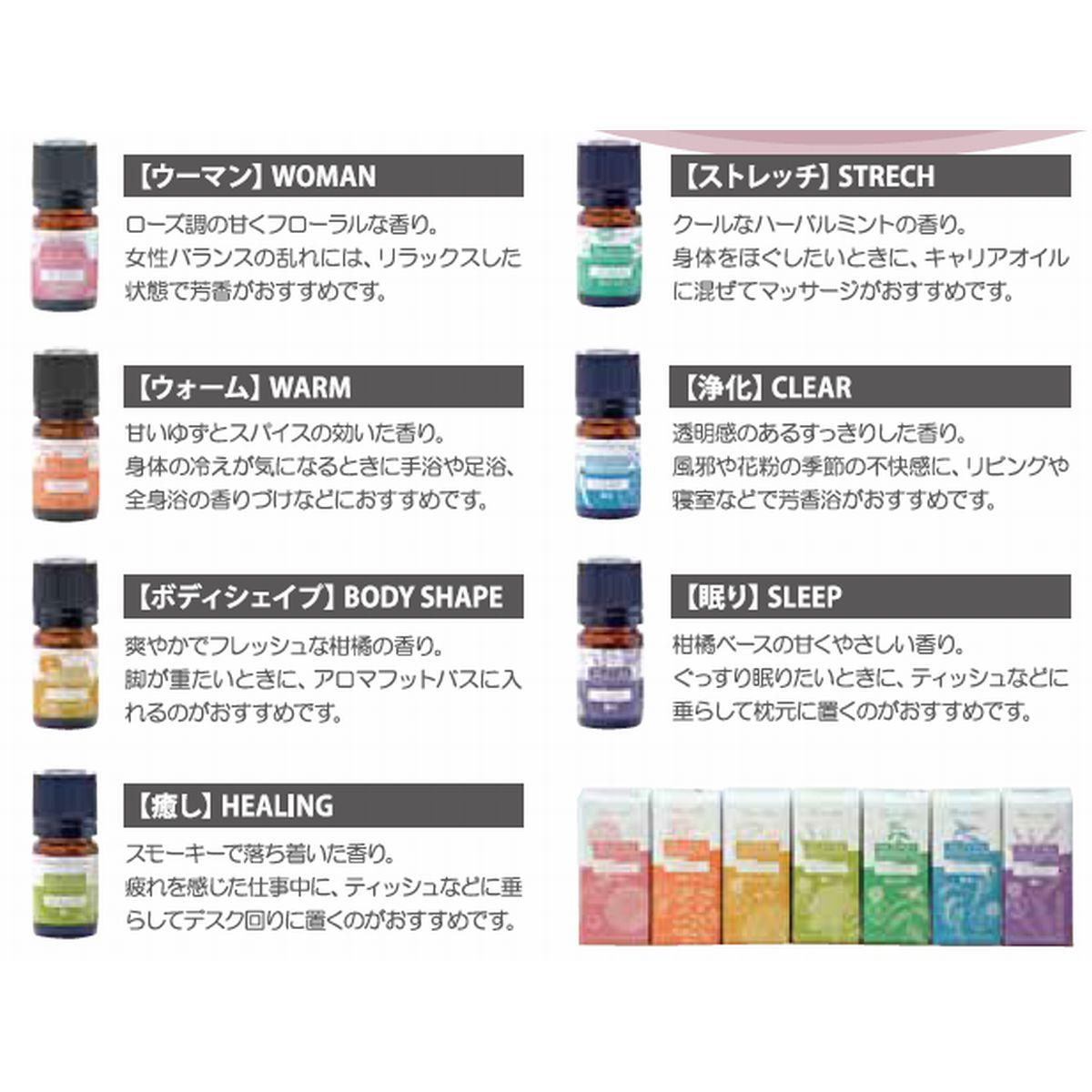 暮らしに役立つシーン別のブレンドなので、これからアロマテラピーを始めたいという方にも取り入れやすく、1本で手軽にアロマが楽しめます。