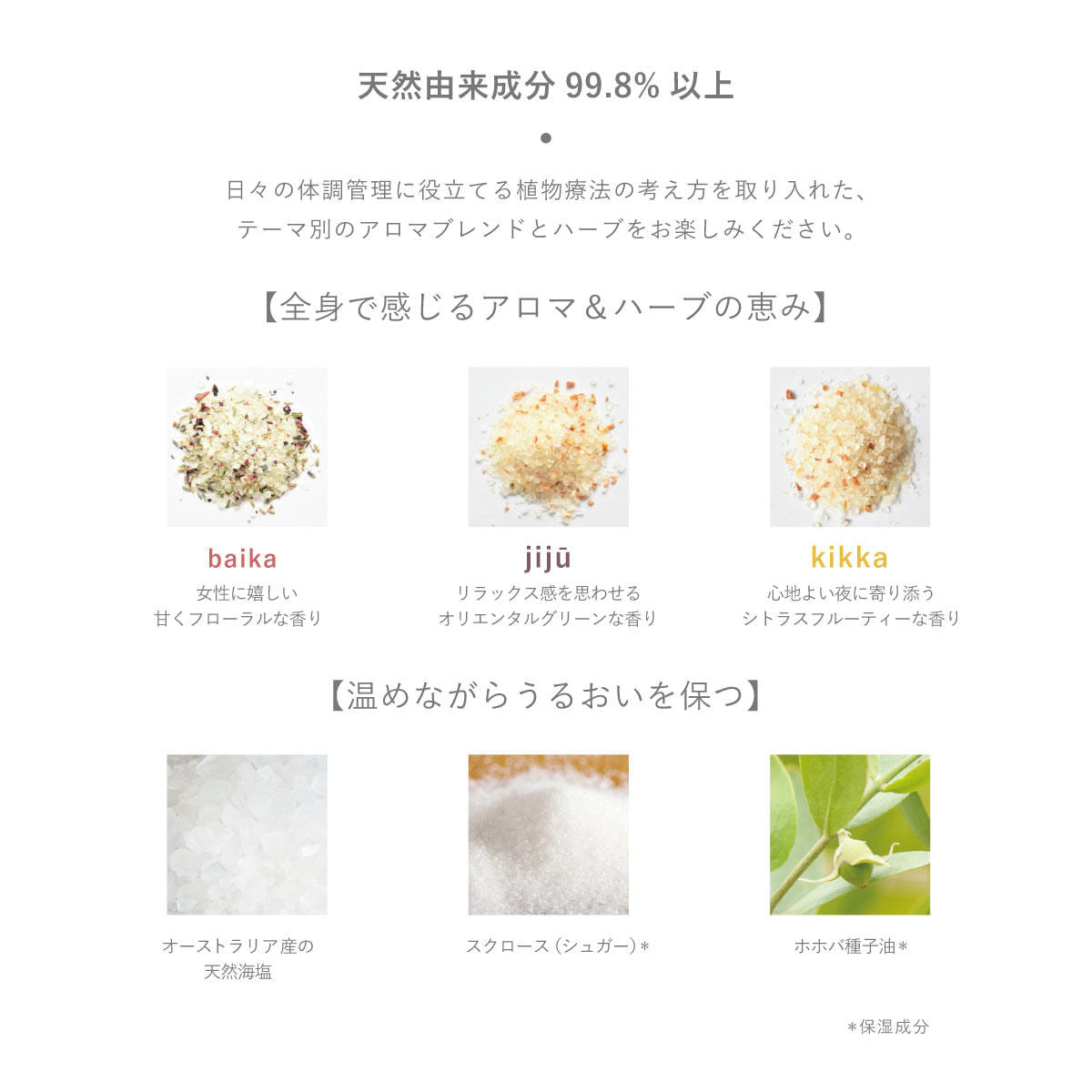 海塩、ウンシュウミカン果皮※、ヒノキ※、スクロース、ホホバ種子油、ウンシュウミカン果皮エキス、トウキ根エキス、ケイ酸Ca、エタノール、水、BG、ヒノキ木油※、カナリヤノキ樹脂油※、ボスウェリアネグレクタ樹脂油※、ラベンダー花/葉/茎油※、ビャクダン油※、ベチベル根油※、パチョリ葉油※、ビターオレンジ花油※ (※香り成分)